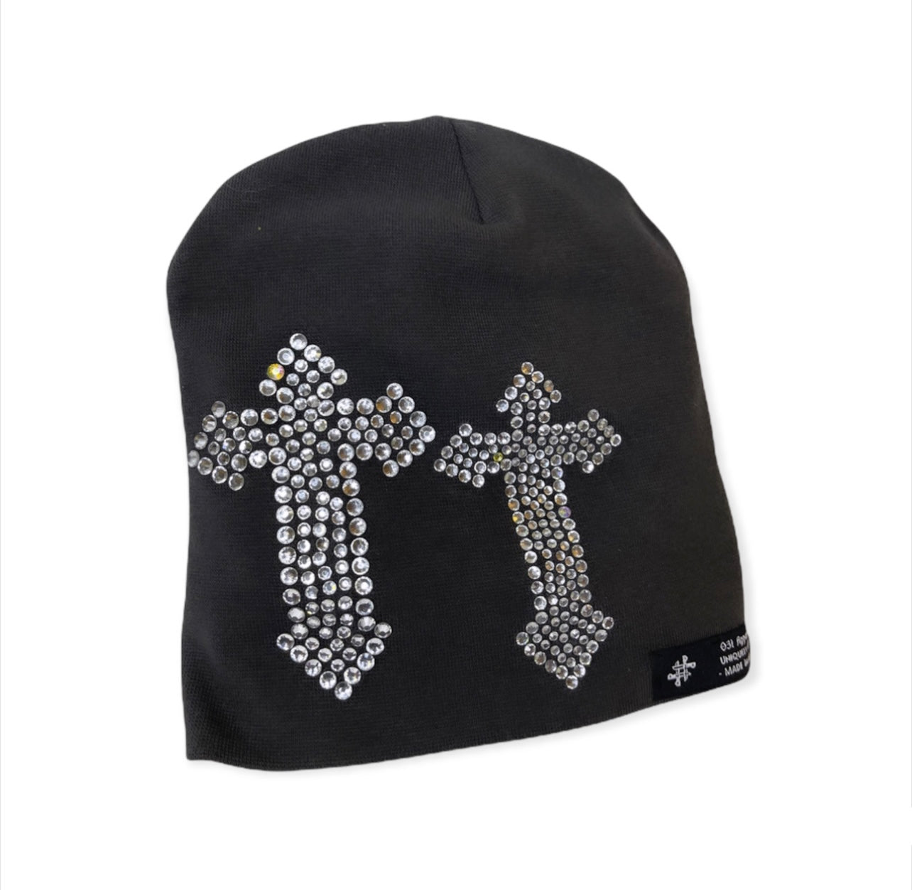One of one, charcoal gray beanie with decorative rhinestone crosses. Hand bedazzled.