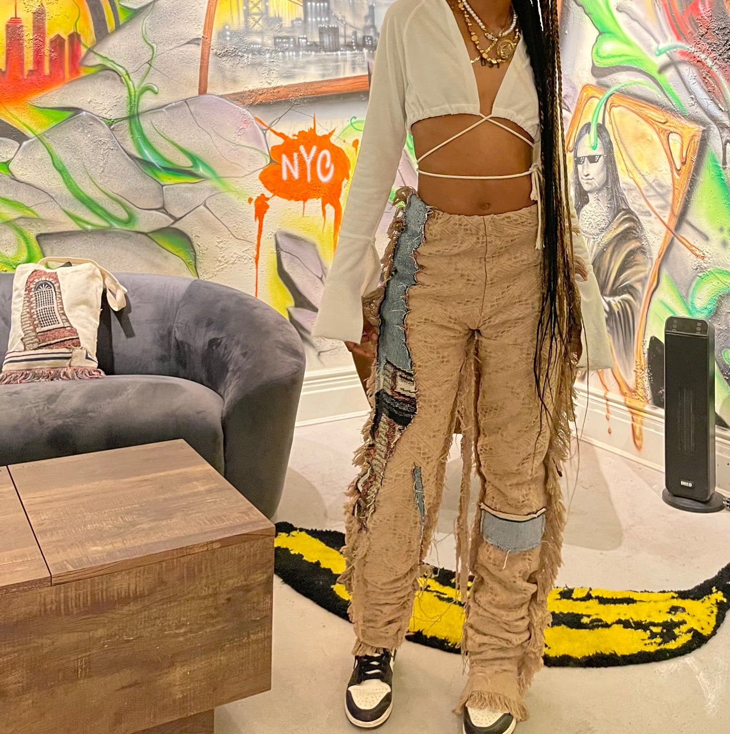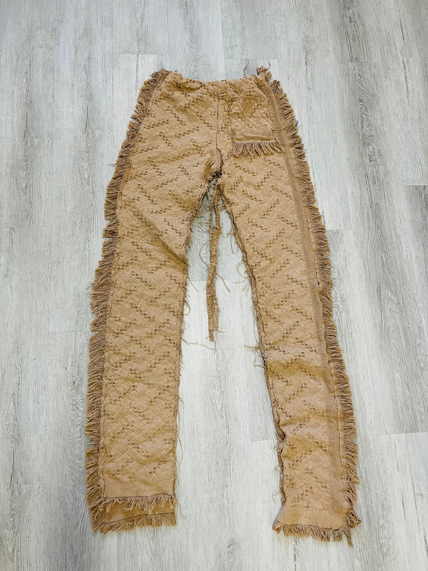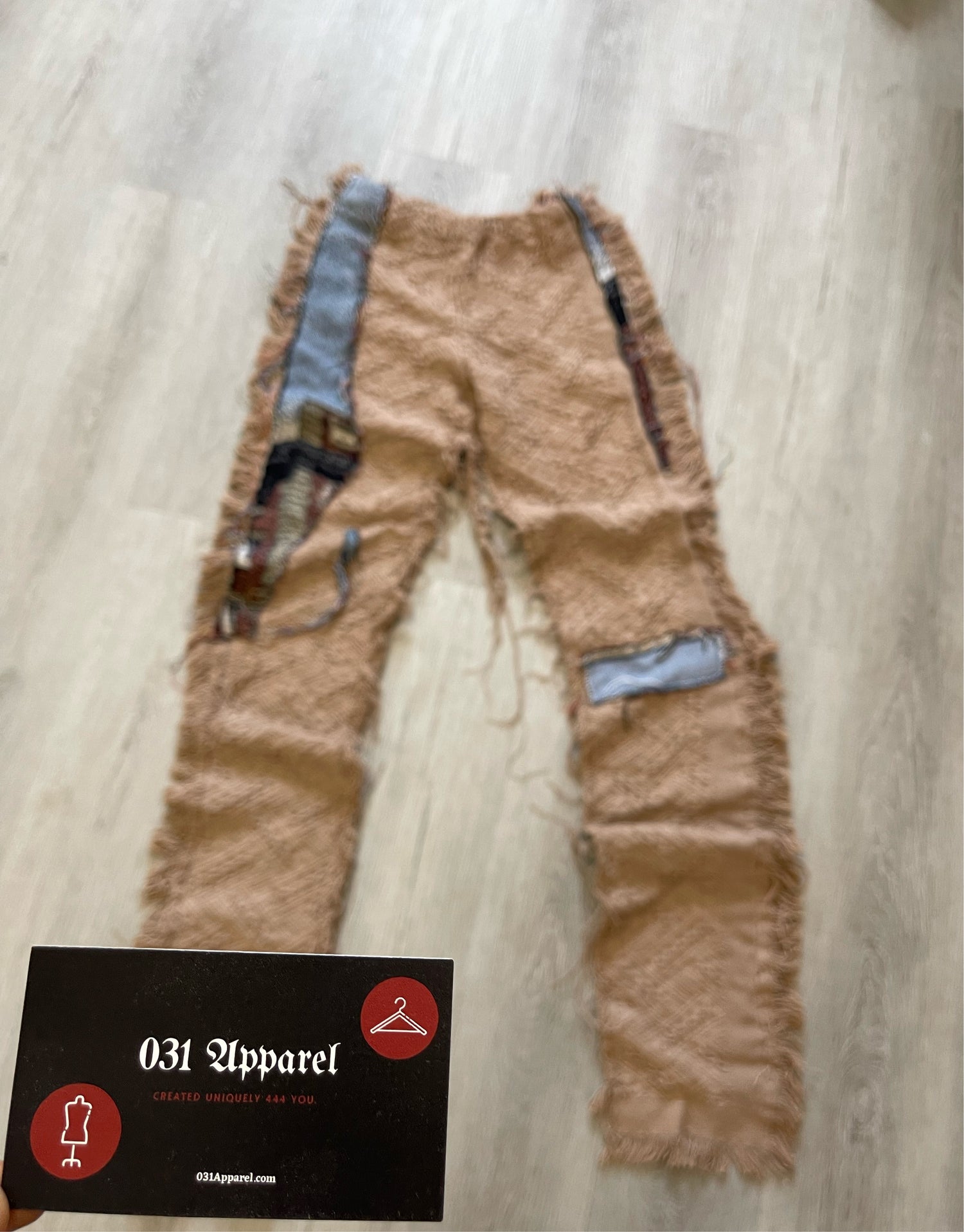 These pants were handmade and cut from a vintage couch cover! They’re comfortably stacked at the bottom and loose-fitting around the leg. These pants can fit a size small and medium!
