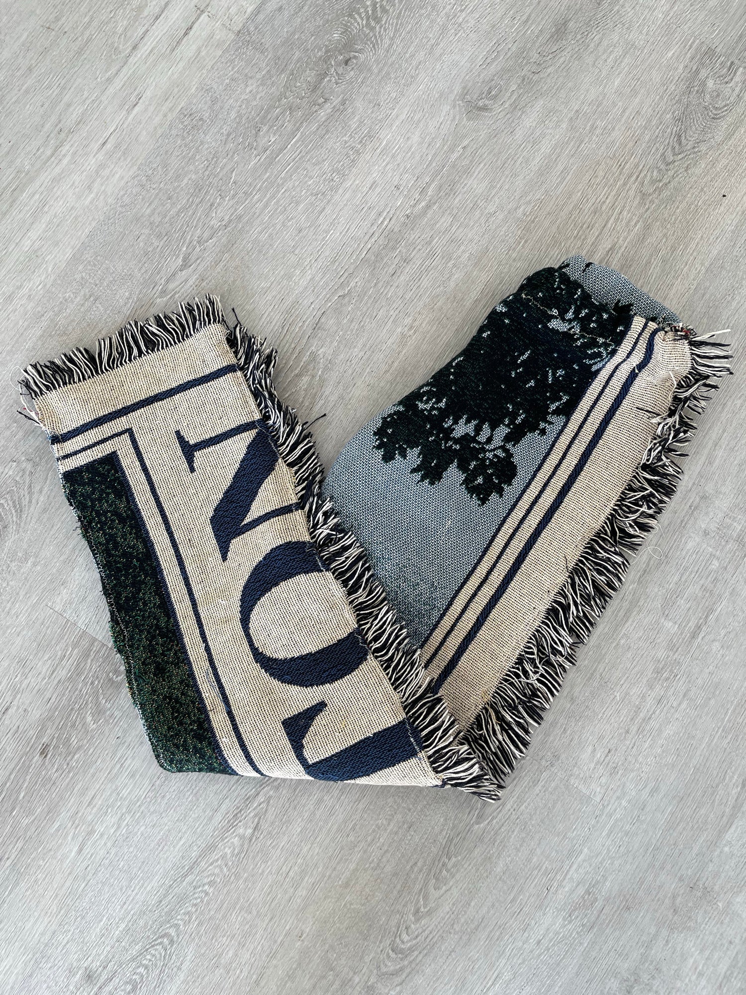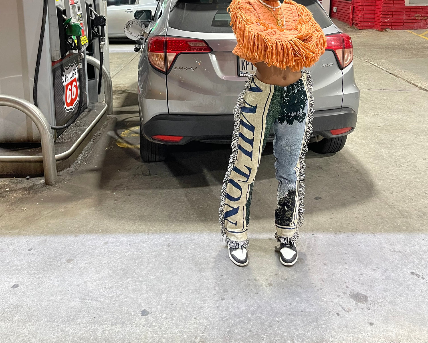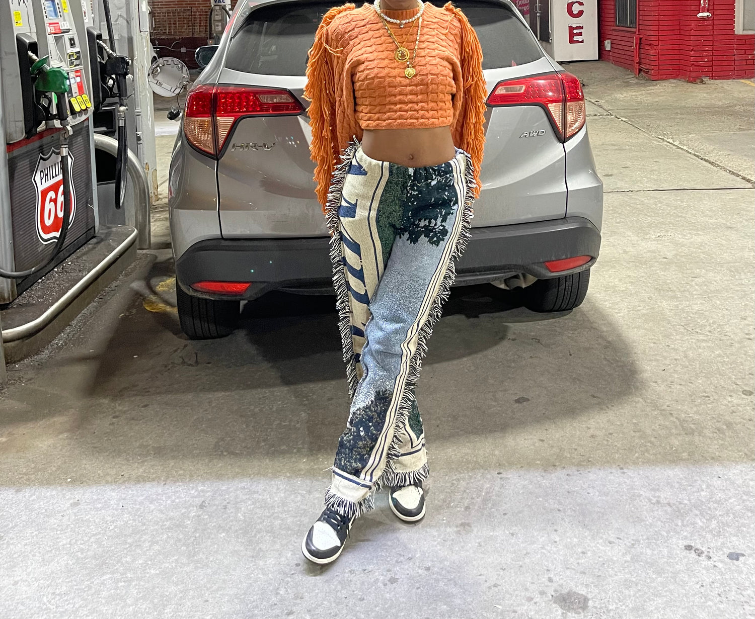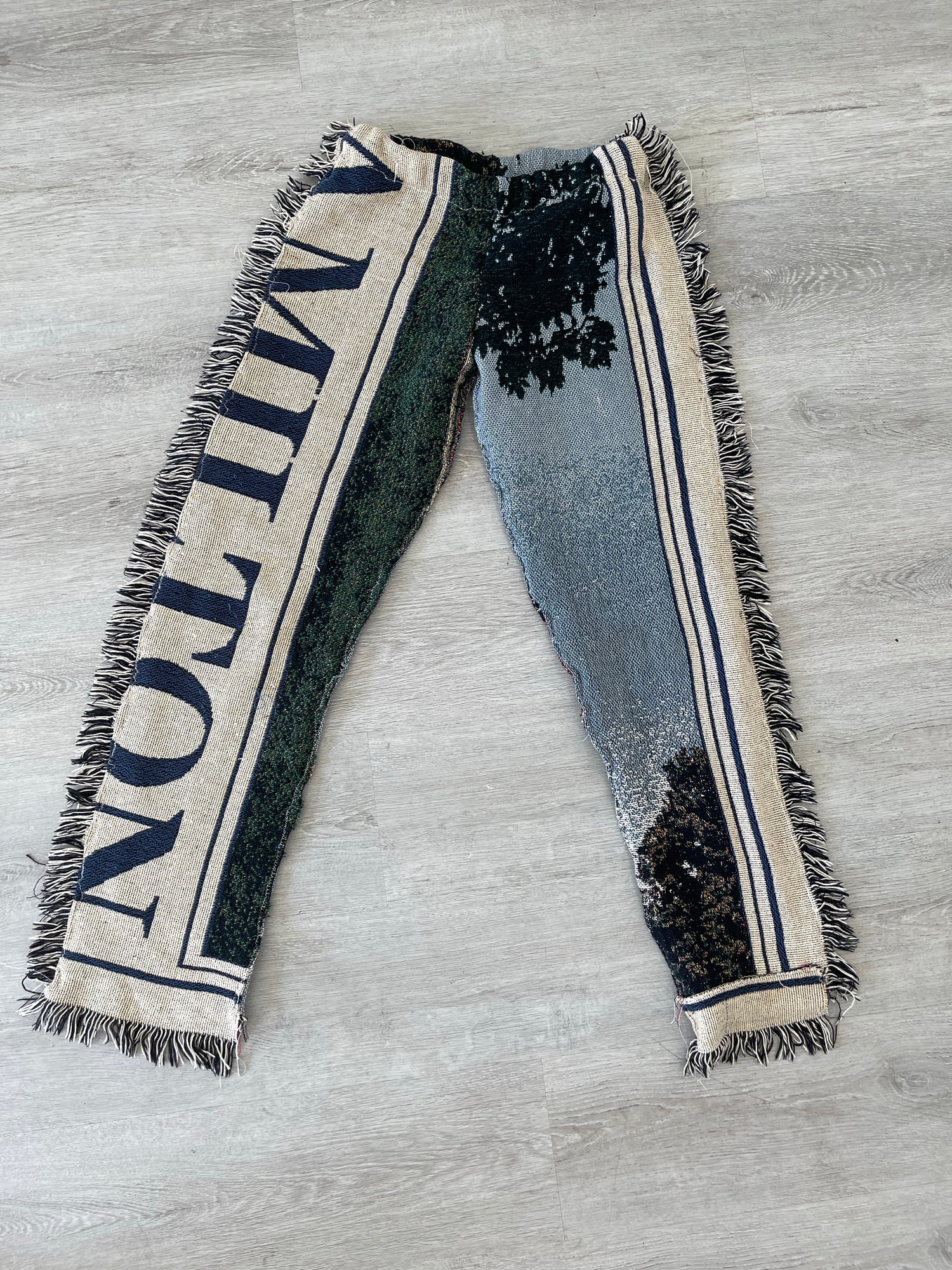Trendy tapestry blanket pants made from a heavy duty Hamilton College tapestry blanket. These pants are handmade to sit comfortably around the waist; not too tight and not too loose. These pants can fit a size small & medium perfectly.