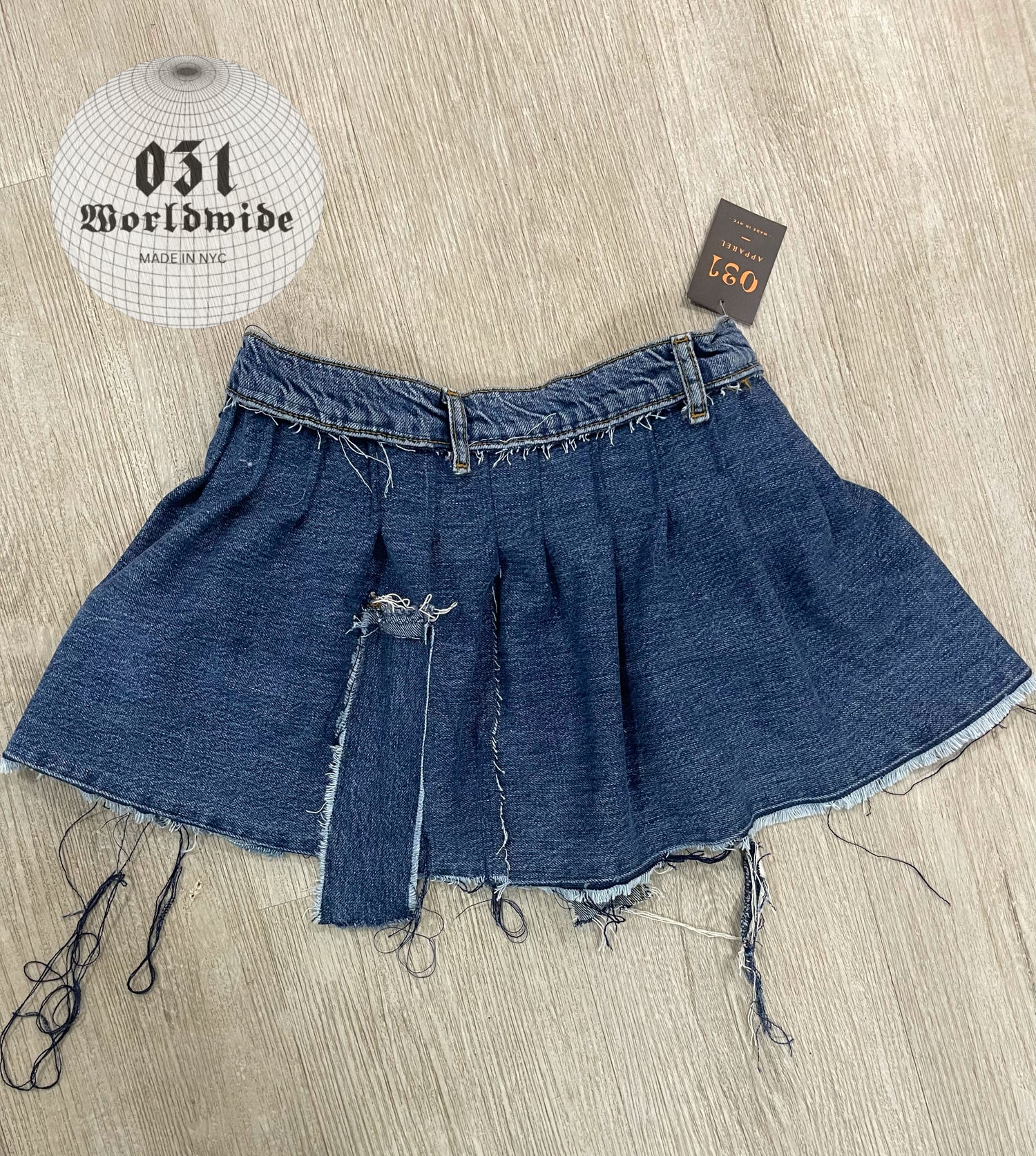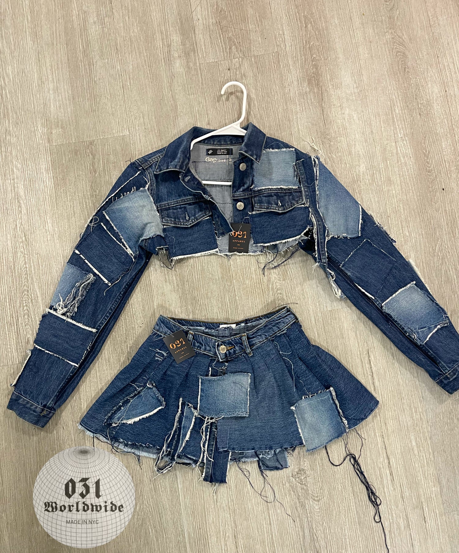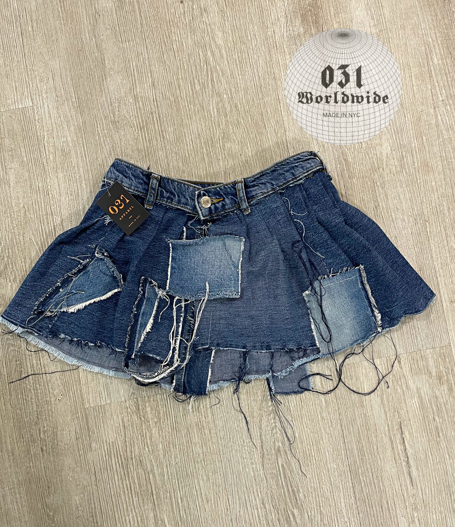These rough hem patchwork pleated skirts come in a variety of sizes & denim washes. They pair great with our patchwork cropped denim jackets!